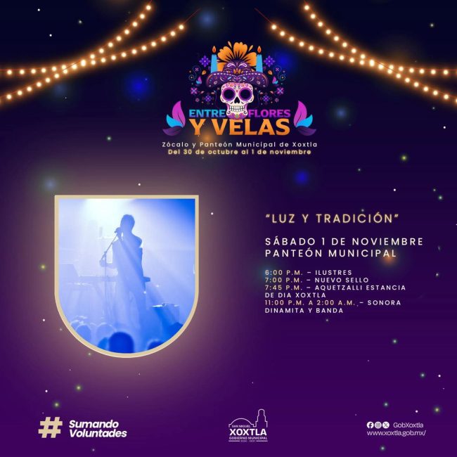 Este sábado 1 de noviembre, el Panteón Municipal de San Miguel Xoxtla se llenará de música, color y sentimiento con el gran cierre del festival Entre Flores y Velas 2025. 💀🌼 Acompáñanos a vivir una noche mágica en honor a nuestras tradiciones con la presentación de: 🕕 6:00 p.m. – Ilustres 🕖 7:00 p.m. –…