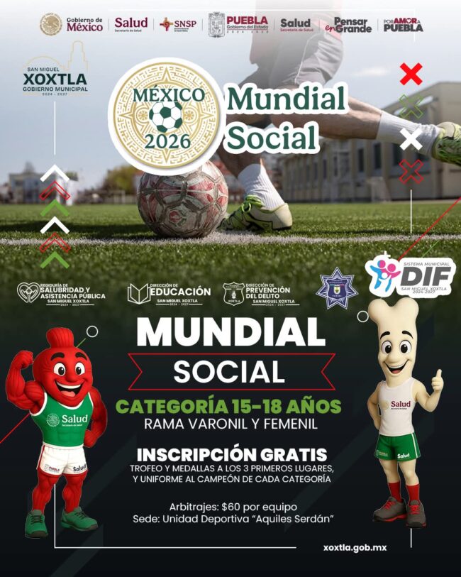 La Presidenta Municipal Guadalupe Ortiz y el H. Ayuntamiento te invitan a participar en los grandiosos Torneos de Futbol 7: “Mundial Social 2026” y el “Torneo por la Paz”. ¡Es momento de demostrar tu talento en la cancha! Aquí te dejamos todos los detalles: ⚽ CATEGORÍAS Y RAMAS * Torneo por la Paz: 11 a…