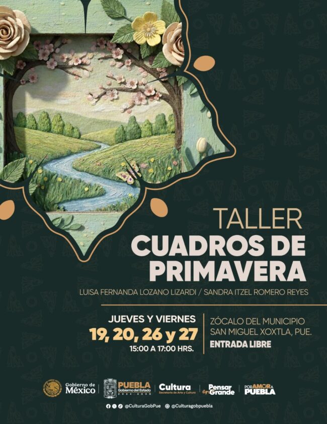 Forma parte del taller Cuadros de primavera 🖌️✨ y expresa tu lado artístico en un ambiente lleno de inspiración. 🌼🎭 📅 19, 20, 26 y 27 de marzo 🕒 15:00 hrs 📍 Zócalo de San Miguel Xoxtla 📝 Registro aquí: https://forms.gle/JaLrLQRnNQJXDB1G6 Colores, creatividad y arte en cada trazo. 🌈💐 #PorAmorAPuebla Informes e inscripciones con el…