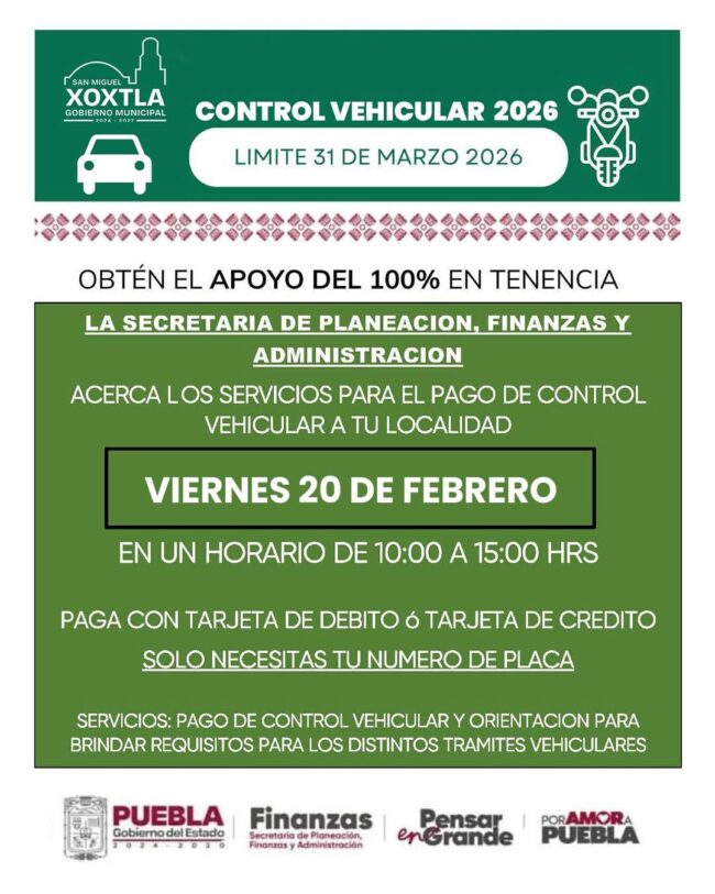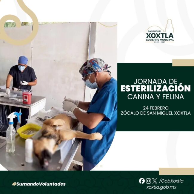 El H. Ayuntamiento de San Miguel #Xoxtla, a través de la Regiduría de Salubridad y Asistencia Pública, invita a la Jornada de Esterilización Canina y Felina. 🗓️ 24 de febrero de 2026 📍 Zócalo 🕛 9:00 am Se cuenta con 50 fichas disponibles, favor de acudir por la suya a las oficinas de Salubridad. Requisitos:…