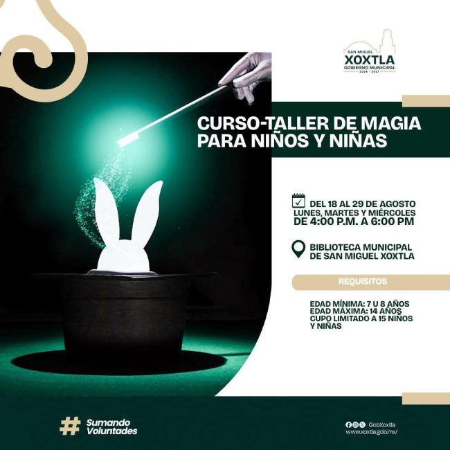 El Gobierno Municipal de San Miguel Xoxtla invita a todas y todos los pequeños a formar parte del Curso-Taller de Magia, donde podrán aprender divertidos trucos y desarrollar su creatividad. 📅 Fechas: del 18 al 29 de agosto (2 semanas intensivas) 🕓 Días y horario: lunes, miércoles y viernes, de 4:00 p.m. a 6:00 p.m.…