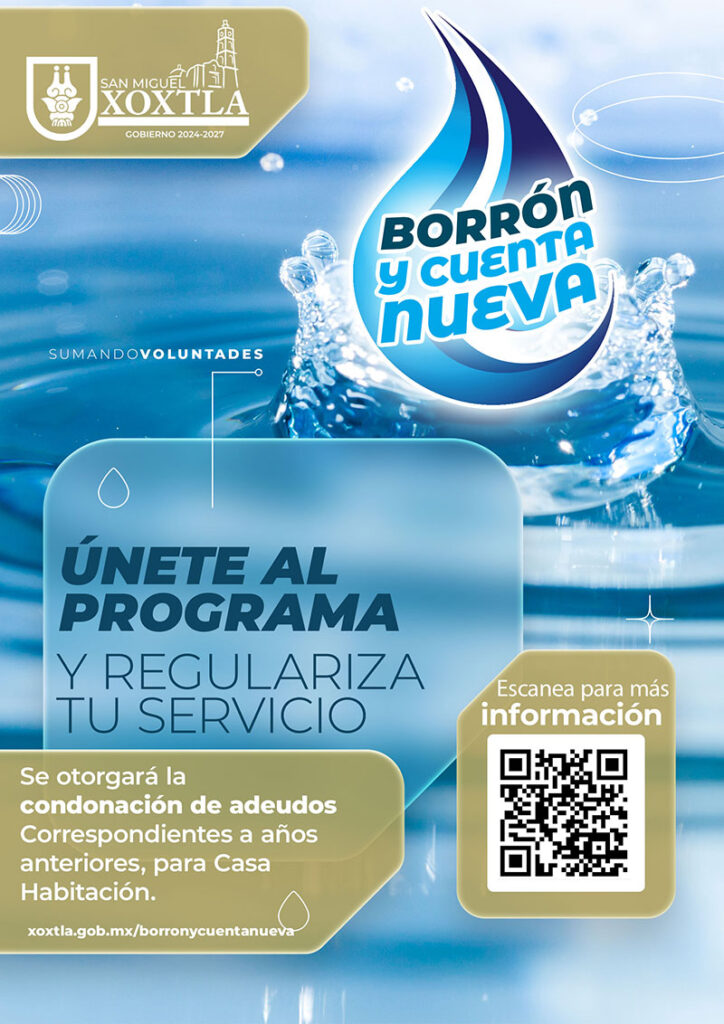 El programa “Borrón y cuenta nueva”, busca fomentar la participación de la ciudadanía en el mantenimiento de la red de agua potable del municipio, por medio de su regularización, se obtendrán recursos para mejorar las condiciones de abasto, además de brindarles el apoyo en la condonación de adeudos anteriores.